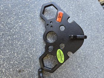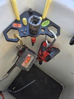We then integrated a Key Biscuit into the top side for quick storage of our cotter keys. Next we enlarged the 2 hexagonal holes in order to easily fit the bigger hammer handles, Transmission sockets, and pop tools. The middle hole is still perfectly milled to fit the bone sockets we all love. We decided to keep the hole for holding that spare bolt between tasks as well as the Nut/Washer Stud on top of the brace. This tool will have a 60lb rating and still hangs perfectly back to back with our Boomerhangs #BH549 that mounts on the exterior of the bucket. Im real proud of how we got this one dialed in. Just Make sure you use 2 INCH HOOKS on these, using 3 inch hooks will cause unwanted tilting during use under load. The CornerPocket is the only tool available that mounts in the Corners of our buckets which utilizes the 40" of wasted corner space that every bucket has had. These come with a lifetime warranty so if anything ever fails, we send you a new one for free no questions.
