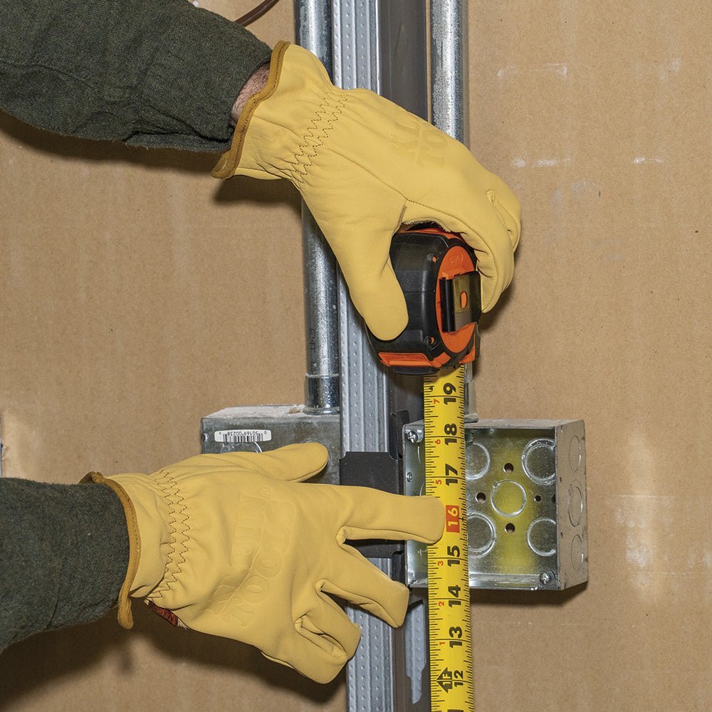 Klein Tools Cowhide Leather Work Gloves are made to last with the high abrasion resistant top grain cowhide leather construction. The gun cut design offers higher dexterity by minimizing excess leather around fingers, making these gloves flexible. Constructed with a dual layer of split leather on the palm offers a high abrasion resistant reinforcement, increasing the lifespan of these gloves.