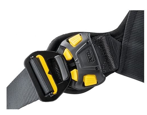 - DOUBLEBACK self-locking buckles at the rear of the harness, between the waist belt and the leg loops, allow for an adjustment for use on the dorsal attachment point. In case of a fall on this point, a shorter adjustment allows the weight to be taken up on the leg loops so that the user may remain more comfortably suspended while awaiting rescue